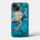 Fotografia subaquática de uma tartaruga marinha nadando em água cristalina logo abaixo da superfície.