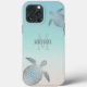 Tartarugas tribais de prata elegantes em um fundo estilo praia de abstrato para ele e para ela. Design costeira moderna. Personalize esta capa de telefone elegante com seu nome e monograma!