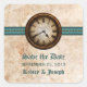 Esses Antigos Relógios Salve os Adesivos de Data apresentam um relógio de vintagem centrado de forma destacada no topo de uma cadeia de esfera metálica e uma borda elegante listrada em teal. O olhar angustiado do fundo de textura de papel granulado completa a sensação antiquada deste design único. Estes imbecis salvam os adesivos são perfeitos para anunciar o seu casamento de vintage ou steampunk inspirado. Fácil de personalizar, basta adicionar os detalhes do casamento nos espaços fornecidos. Clique em "Personalizar" para encontrar opções adicionais para personalizar este design.