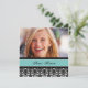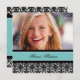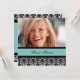 Foto personalizada 16º Convites de aniversário em elegante cor damasco floral clássico preto e azul-turquesa. Adicione seu nome, foto e detalhes da festa para um convite de aniversário 16 exclusivo e na moda doce.
