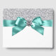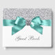 Livro de hóspedes azul e prateado com bonito fita azul lacrimogênea e arco com centro de diamante sobre fundo brilhante prateado. Este elegante livro de convidados azul-lacre é facilmente personalizado para o seu evento simplesmente adicionando o texto da sua escolha no estilo de letra preferido. Este é um design impresso sem brilho real, diamantes, fitas, arcos, etc.