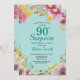 Convite de Aniversário para 90 de Surpresa Floral para Mulheres. Camada De Água Floral, Teal Aqua Turquoise Fundo. Para mais personalização, clique no botão "Personalizar" e use nossa ferramenta de design para modificar este modelo.