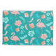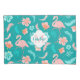 Um bonito padrão floral aqua, rosado e flamingo e flor de hibisco é a característica deste travesseiro temático tropical. No centro há um banner branco ornamentado com seu monograma em cor-de-rosa correspondente e seu nome em um roteiro teal sobre ele. Tudo é colocado sobre um fundo mais escuro.