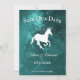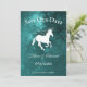 Personalize um anúncio de casamento único com um Teal Unicorn Salve a Data. O design de lançamento apresenta um fundo estrelado com um unicórnio enfeitado com estrelas e texto que você pode personalizar com seus detalhes de data de casamento. Salve ainda o anúncio de data disponível para este design em várias cores. Se precisar de assistência com personalização, entre em contato comigo diretamente.
