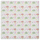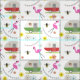 Padrão com ilustrações de campers, flamingos, abelhas, designs de bunting e flores vermelhos e verdes.