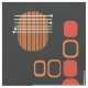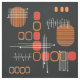 Um design moderno de abstrato-arte que teria ajustado nos anos 50. Várias formas de círculos ovais e linhas em laranja queimado e vermelho alaranjado contra fundo preto.