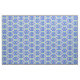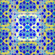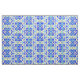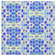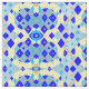 Este tecido contemporâneo apresenta um padrão geométrico abstrato moderno de diamantes azuis e triângulos acentuados com amarelo, ouro, laranja e turquesa.