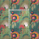 Um padrão floral abstrato verde-arrojado em tons de verde, azul, ouro e vermelho.