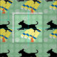 Silhueta de sombra preta de um cachorro com orelhas e uma cauda voando salta um salto longo. O fundo é verde com uma dispersão de pegadas.