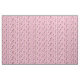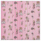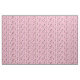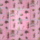 Padrões incluem Alice, rainha dos corações, soldado de cartões, chapéu branco, coelho branco, gato de xadrez, relógio de bolso, chave, coroa, poção, pote de chá e rosas em fundo listrado de cor rosa e branca.