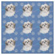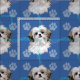 Este estilo artístico bonito e divertido Shih Tzu a cabeça sorri contra um fundo azul com estampas de pata e trilhas em cinzas, lua e rosa. Design por Diane Blackman.
