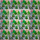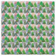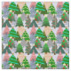 Este tecido tem uma design de árvores de Natal em vários tons de verde, rosa, prata e ouro com diferentes decorações.