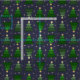 Um motivo decorativo, mas simples, mostrando padrão repetido de árvores de Natal. As árvores são desenhadas digitalmente, têm vários tons de verde. Há uma estrela brilhante em cima de cada árvore, e também há muitas estrelas brilhando sobre o fundo azul sólido. A cor de fundo pode ser substituída. Este design existe em várias versões e em muitos produtos correspondentes.