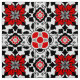 Tecido em um padrão de azulejo marroquino Art Deco baseado em flores e folhas estilizadas - vermelho chinês profundo com preto clássico e branco, acentuado com cinzas de prata / cinza
