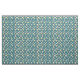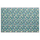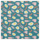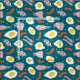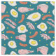 Tecido azul escuro com uma comida divertida de ovos fritos para café da manhã, bacon e salsichas