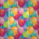 Este tecido colorido caracteriza balões nas máscaras da cerceta, vermelho, laranja, roxo e verde, e polvilhado com os confetes coloridos das bolinhas. Aperfeiçoe para projetos sewing e de artesanato do aniversário!