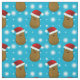 O padrão reproduzido de batatas de Natal castanhas vestindo chapéus de Papai Noel vermelhos com cintas brancas e pompas peludas. Atrás está um fundo azul com flocos de neve brancos cintilantes.