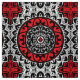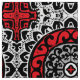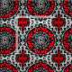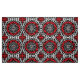 Tecido inspirado do sudoeste/asteca do design de matéria têxtil do batik em um teste padrão do seletor/mandala do sol - tomate rico vermelho, preto e branco, acentuado com cinzas de prata/cinza