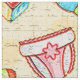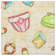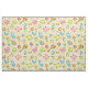 O padrão do tecido tem filhotes de fraldas, blocos de construção, chapéus de tricô, mitenes, garrafas, canecas e muito mais.