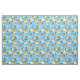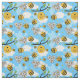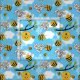 Um tecido super fofo, com um sorriso feliz de mamangabas, colmeias, favos de mel e flores, num céu azul de Verão