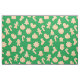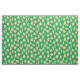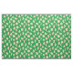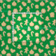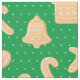Este tecido de algodão de férias bonito apresenta um padrão de bolinhos de gengibre bronzeados de meias, gengibres, doces, sinos, árvores de Natal e muito mais sobre um fundo verde com pontos brancos. Desenhada pela artista Susan Coffey.