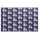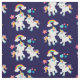 tecido com um padrão repetitivo apresentando 2 unicórnios dançantes bonitos com caudas brilhantes e coloridas, e mano. Um arco-íris colorido com nuvens em cada lado acima de suas cabeças. Outros elementos incluem uma pequena flor, um coração e algumas estrelas. Fundo roxo escuro.