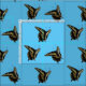 Imagem fotográfica da borboleta preta e amarela, replicada em três ângulos diferentes, e depois colocada através do tecido. Anise Swallowtail (Papilio zelicaon) Fundo azul claro.