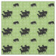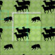 Um clássico rebelde de Collie guarda um grupo de quatro ovelhas sob controle. As ovelhas e o cão são pretos sólidos - alguns com traços brancos finos. O fundo é um design de repetição padrão de vários tons de verde vagamente redondo.
