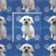 Cachorro maltês de estilo artístico bonito em fundo azul com estampas de pata e trilhas em cinza. cor-de-rosa e azul. A fotografia original foi modificada para lhe dar uma aparência pintada.