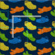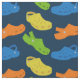 Ponha seu melhor pé para frente enquanto você artesanato seu próximo projeto de costura com este tecido de padrão divertido. O material apresenta ilustrações de calçados plásticos de moccasina em amarelo, verde limão, laranja e azul brilhante contra um fazer azul marinho, perfeito para quem prefere um estilo de vida casual.