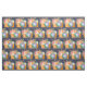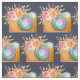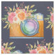Tecido com um padrão repetitivo que apresenta uma ilustração de aquarela de uma câmera laranja e um buquê floral descansando no topo. As flores do buquê são rosas claro e laranja com folhas verdes, um bonito arranjo floral.