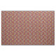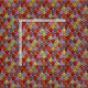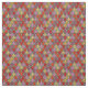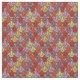 Este tecido tem um design de tulipas de deco de arte de pentágonos e trapezoides em laranja, vermelho, roxo, ouro e verde.