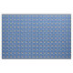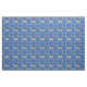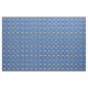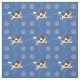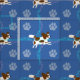 Estilo de desenho Papillon saltando sobre um fundo de azul com estampas de pata e trilhas em cinza, rosa e azul.