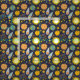 Um desenho animado, de espaço externo, sem soldadura sobre fundo azul marinho. Design inclui texto "Espaço Exterior" e "Cosmos". Planetas, luas, sóis, estrelas e galáxias também incluíam.