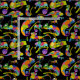 Este tecido com padrões apresenta ilustrações bonitas do estilo cartoon de camaleões em cores brilhantes e arco-íris contra fundo preto. Este material é perfeito para a elaboração de projetos amigáveis para crianças para fãs de camaleões e outros répteis.