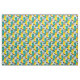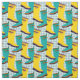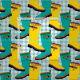 Galoshas coloridas ou botas de borracha em amarelo brilhante e turquesa são apresentadas neste padrão branco contra formas de guarda-chuva de abstrato com hastes.