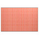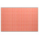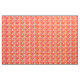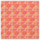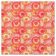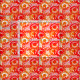 Esse tecido tem um design de círculos decorados com linhas e círculos feitos de pontos repetidos em vermelho e laranja.
