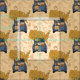 Um tecido bege mostra uma cena aquosa de uma vista traseira de um carro, empilhada alta com malas e caixas coloridas, evocando o encanto de uma viagem ligada à faculdade.