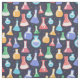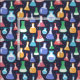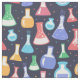 Tecido temático de química colorida com ilustrações de frascos de laboratório e pontos fofos em um fundo azul-marinho. Se você é químico, estudante de química ou professor e gosta de artesanato, este tecido lhe dará a oportunidade de unir seus dois interesses.