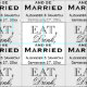 Um design de tipografia de vintagem nostálgica com script e elementos de tipo simples. O fundo branco plano sólido é bonito para um tema de casamento no verão ou no exterior. Dine, tenha comida, consuma bebidas e eu feliz enquanto participava de núpcias