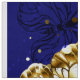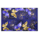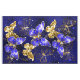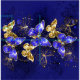 Composição de borboletas luxuosas de safira e joias de ouro em fundo azul texturizado.