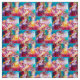Branca colorida, artística, abstrato, pintura contemporânea de aquarela figurativa com três figuras de jogador, espirais florais, rosas, flores, brilhos dourados, folha prateada em cores vibrantes amarelas, verdes, azuis, cor rosa fuchsia.