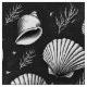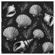 Tecido em conchas e padrões delicados de algas, dispostos sobre fundo preto, criando um contraste impressionante. O trabalho detalhado acrescenta à composição uma sensação intrincada e naturalista.