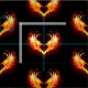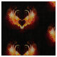 Coração de anjo com asas flamejantes em fundo preto.