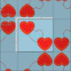Imagem gráfica de um "coração-arame" flanqueado por dois corações "sólidos" num ângulo de 45 graus. Este motivo se replicado no azulejo "espelhado", formando quadrados esboçados em corações. O fundo azul claro pode ser personalizado.
