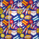 Tecido de criança divertida, impresso com bolas de boliche, calçados e camisas, greves, pinos, pizzas e cachorros-quentes sobre azul brilhante