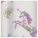 Um padrão bonito e colorido de unicórnios de cristal (cada unicórnio é feito a partir de minúsculos cristais de cor arco-íris - impressos apenas) com faíscas azuis e cor-de-rosa na extremidade de seus chifres. Eles estão todos a brilhar sobre um fundo luxo de prata, com pequenas pilhas de brilho ouro espalhadas à sua volta.