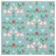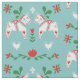 Tecido nórdico de Natal com um padrão de cavalos Dala suecos em branco com detalhes em vermelho, azul e verde rodeados de flores e corações.
