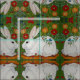 Meu mural original de azulejo cerâmico de coelho branco, protegido por direitos autorais, tem um fundo verde e flores brilhantes, e é intrigantemente recriado neste tecido.