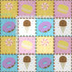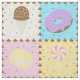 Satisfaça o seu doce dente com este padrão colorido que apresenta gostosões como um cone de sorvete de chocolate, uma rosquinha de chocolate fosco púrpura, um macarão amarelo-limão, e um pirulito rodoso, rosa e branco, separado por pedaços de chocolate e cercado por aspersão arco-íris em quatro quadrados brilhantemente abarrotados.